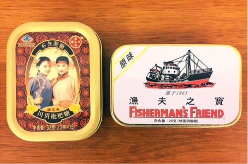 中国的のど飴のパッケージが、結構好きです。 写真左は、「川貝枇杷糖」。 広州で生産されてます。 写真右は、「漁夫之宝」。 原産地はイギリスです。 どちらも、レトロなデザインと中国語がマッチしてます。 「川貝枇杷糖」のほうが食べやすい。 「主要原料…