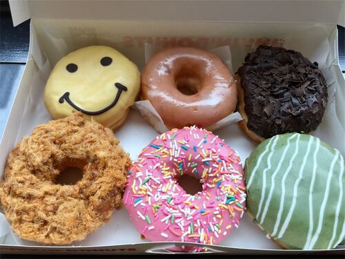 アメリカのダンキンほど甘くなく、見た目ほど重くありません。 で、2人で2日で完食。 主人は「楽勝、ラクショー!」と言ってました。 スマイリーは、バナナクリーム入り。 肉松ドーナツ(写真の前方1番左)は、私は食べなかったんですが、主人によると「中国…