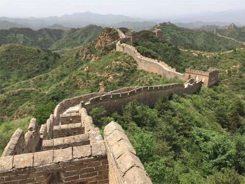 約2名の方から「金山岭長城は素晴らしい」と聞いていて、気になってました。 修繕されてるエリアですが、壊れたままのタワーも。 こんな階段とか。 こんな階段とか。 でも、1番歩きにくかったのは、ツルツルな表面。 とても滑りやすいです。 ビーチサンダル…