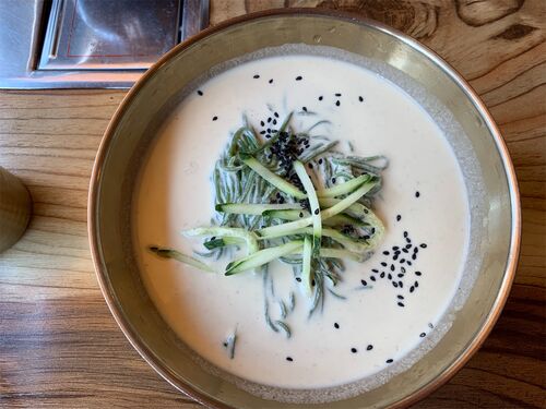 「コングクス(콩국수)」は、冷たい大豆スープの麺。 韓国ならではの、夏メニュー。 暑い日でも、スルスルと食べれます。 淡白なスープなので、キムチと合います。 江南餃子カルグクス(강남교자갈국수)ソチョ店に行きましたが、麺が緑色。 クロレラ入りだ…