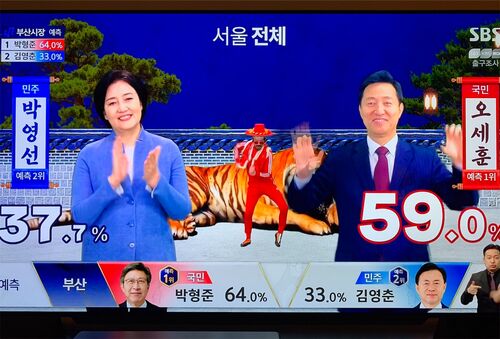 昨日は、ソウル市長・釜山市長の補欠選挙がありました。 夜、結果が気になり、TVで選挙速報をチェック。 民間放送のSBS。 なんだこれは?! Kポップ調! 真面目な画面もありましたが、時々このようなポップな映像が出てきて、面白いと思いました。 放送時点…