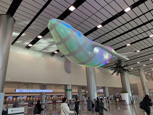 チェックインカウンターの階にある電光クジラ。 保安検査場を抜けると、滑走路の見える窓が。 窓の所々に韓国語のメッセージが書いてあります。 「来ても行っても気分の良いチェジュ空港」 (오멍가멍はチェジュ語で오가며という意味のようです。) 「あなた…