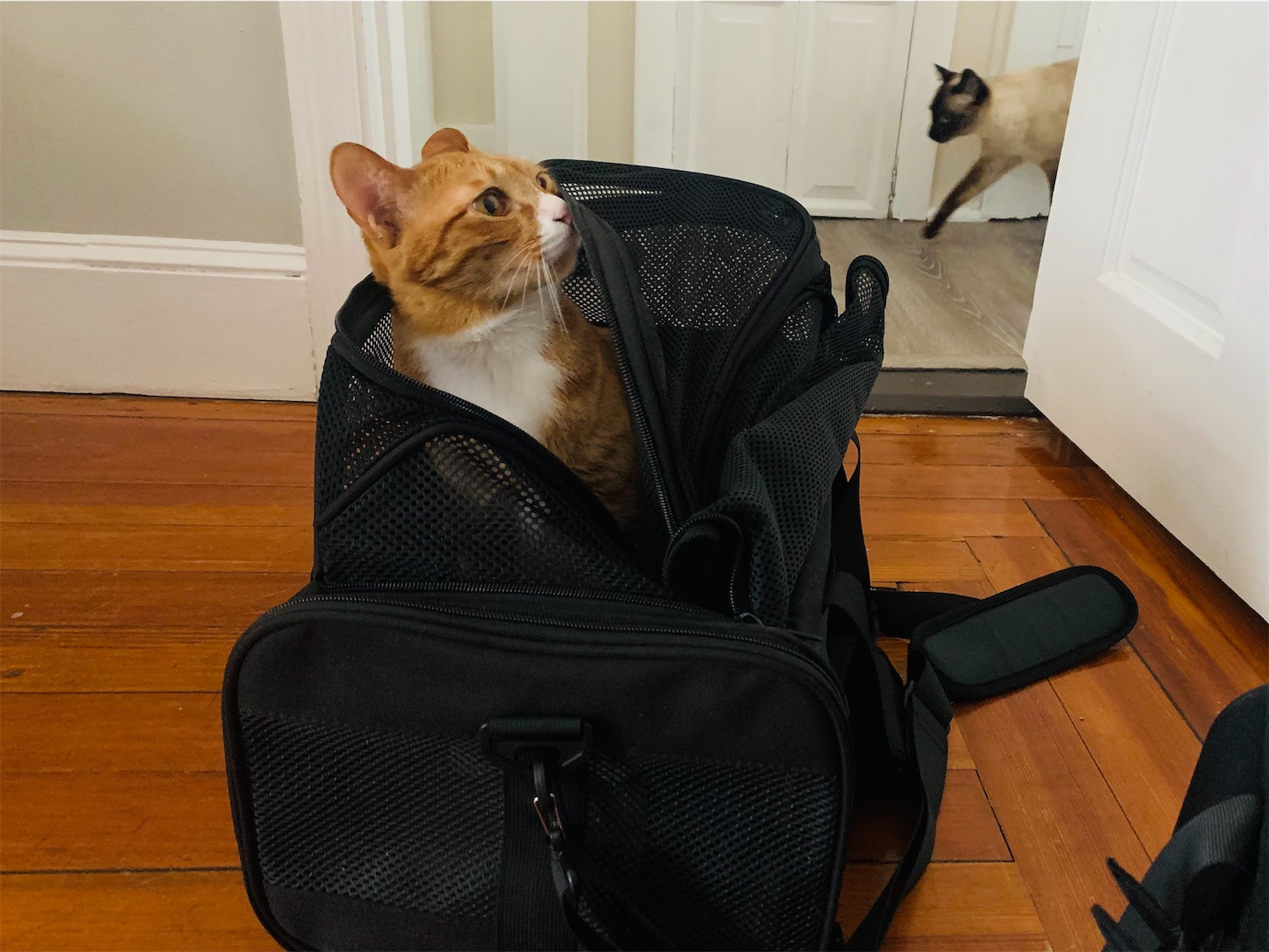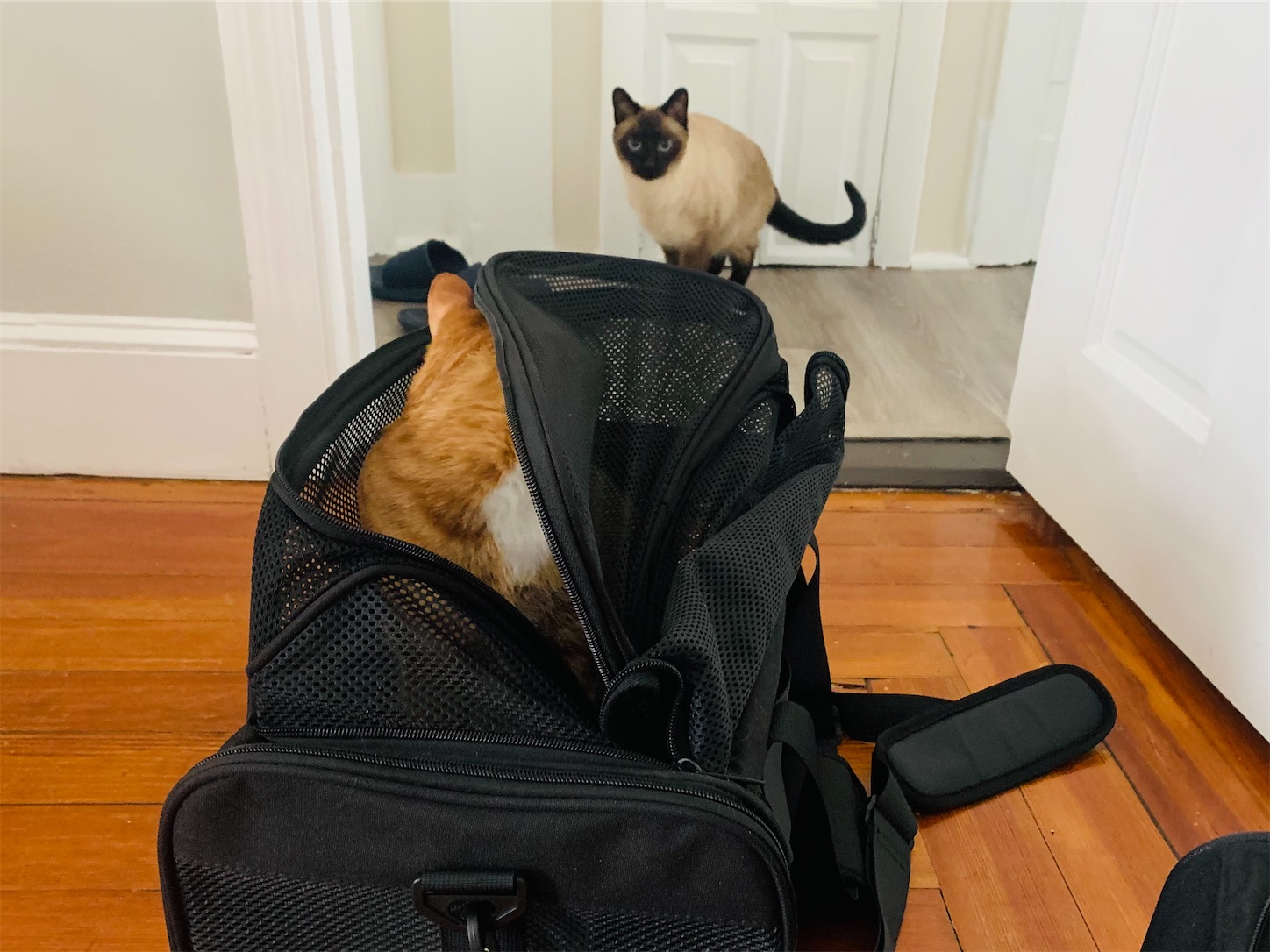 2023-11-24 多分あまり賢くないネコ ネコズ 先月、ネコズを動物病院に連れていきました。 自宅に戻り、キャリアを片づけず置いたままにしました。 数時間後。 茶トラがキャリアに入ってくつろいでます。 シャム猫:「それに入ったら嫌な所に行かされるのに、ニャンで入ってるの?!」